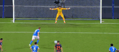 第34分鐘,迪洛倫佐造點,德布勞內主罰命中,那不勒斯1-0